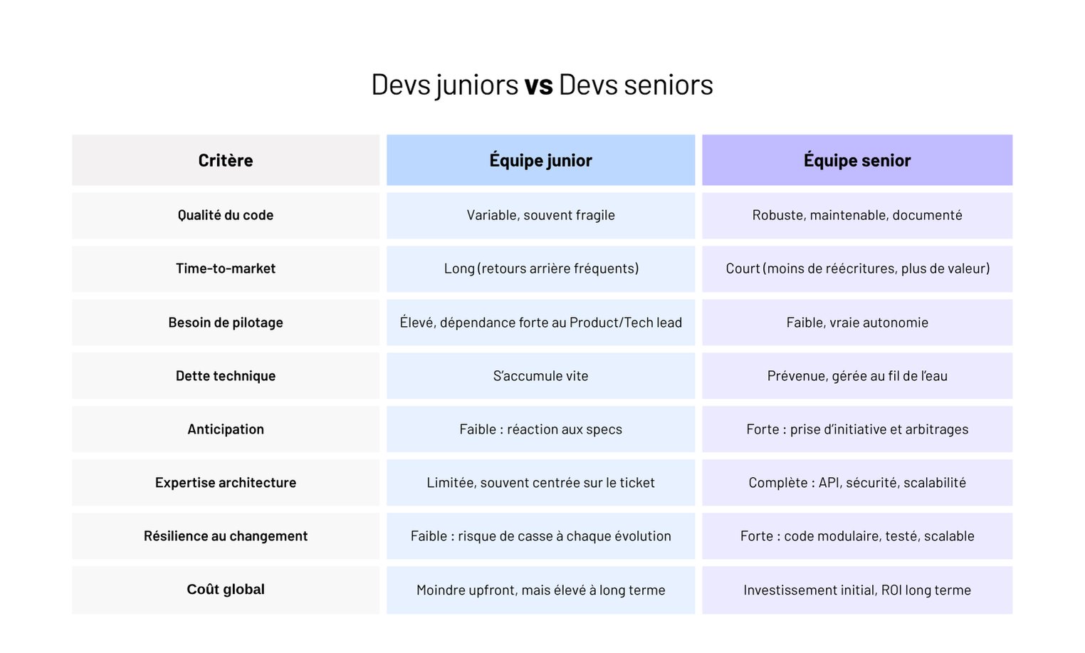 Trop d’entreprises pensent réduire les coûts en staffant “junior”. Résultat : un produit qui met deux fois plus de temps à sortir, des bugs en cascade, une dette technique ingérable, et un refacto avant même d’avoir atteint les 100 premiers utilisateurs.